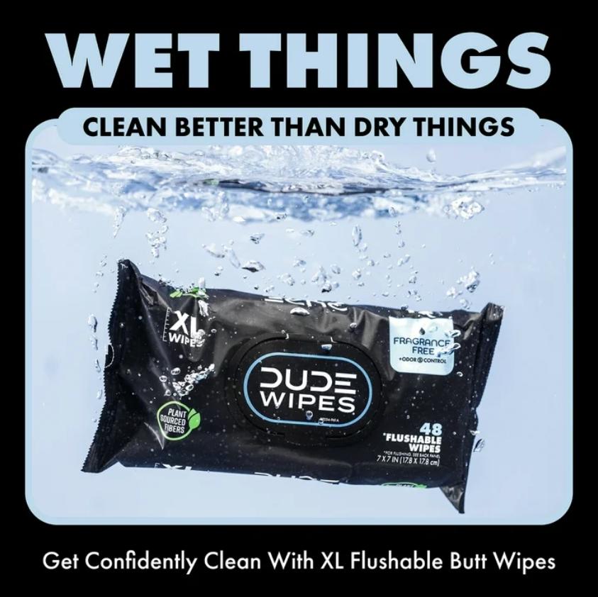 • Send toilet paper back to the Stone Age where it belongs! Made with 99% water and plant-based ingredients, including Aloe Vera and Vitamin E, DUDE Wipes Flushable Wipes are gentle on your skin and formulated for a more refreshing feeling than toilet paper. Created with odor-controlling technology, our fragrance-free butt wipes are hypoallergenic, alcohol-free, and paraben-free. So go ahead and tell your friends: you officially have the freshest butt in the game. When it comes to flushable wet wipes, size matters. Good thing we're big, because nobody wants a little wipe after a big burrito. Our flushable wipes are made with plastic-free and plant-sourced fibers to help protect both the planet and your pipes. Unlike baby wipes, DUDE Wipes begin to break down once flushed, making them sewer-safe and septic-safe. Plus, our plush wet wipes come in sleek dispenser packs that fit perfectly on your throne.