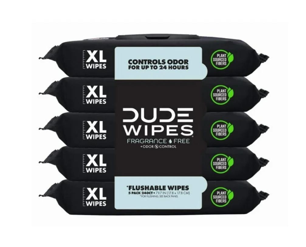 DUDE Wipes Fragrance Free Plus Odor Control, XL Wipes, 48 Count, 5 Pack