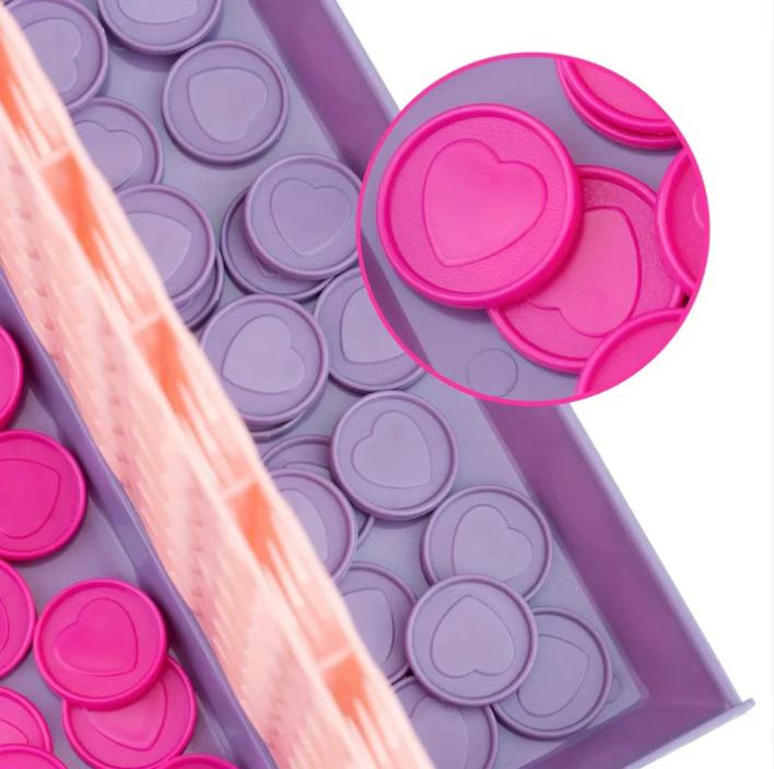 - Bring fun, love, and strategy together with this Heart-Shaped Connect Game, designed to turn every playtime into a joyful moment. Made from durable, high-quality plastic, this game features a sturdy heart-cutout board with smooth edges, making it safe for kids and enjoyable for all ages. The vibrant pink and purple playing pieces add a charming touch while ensuring easy handling during gameplay.